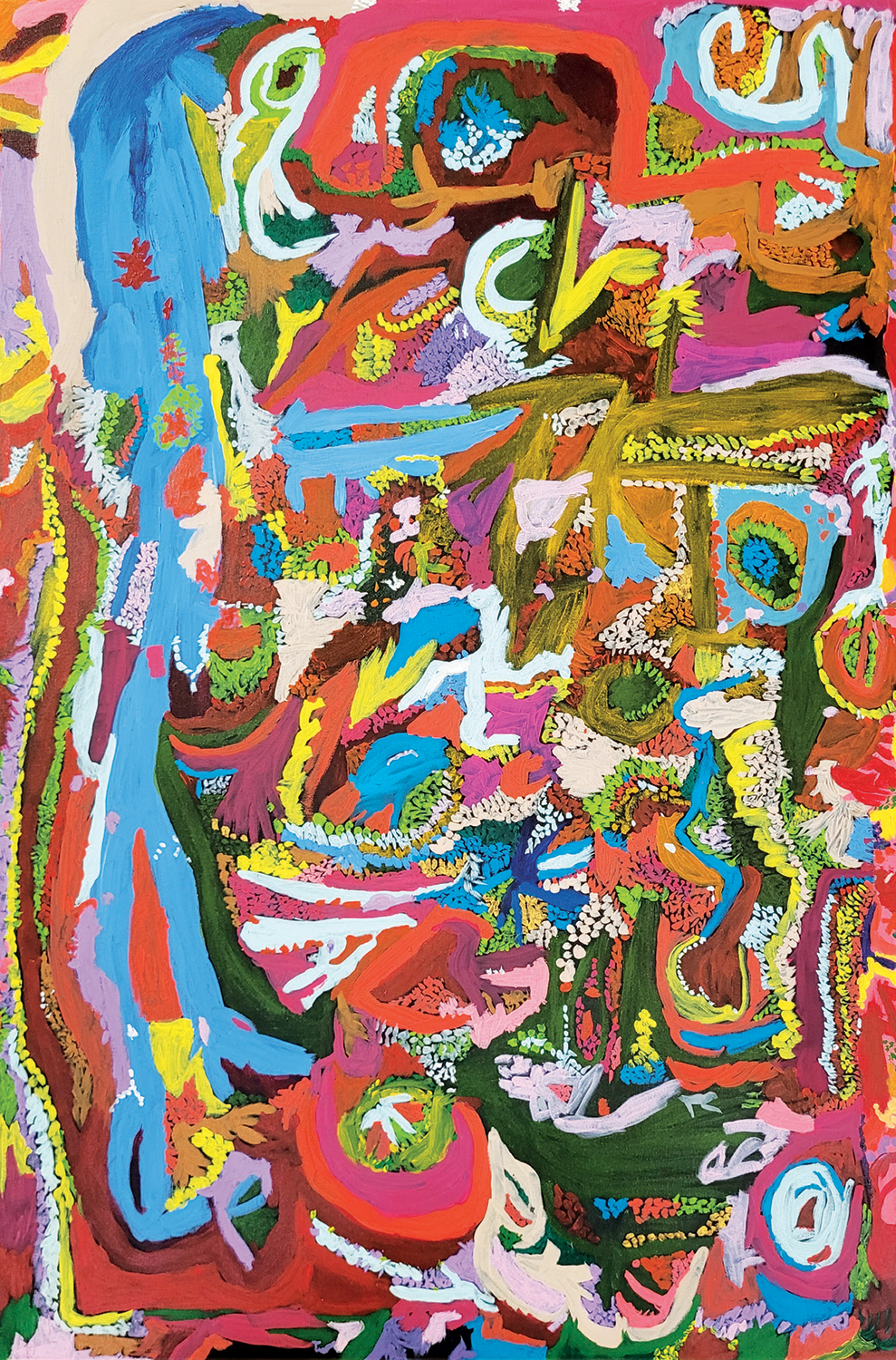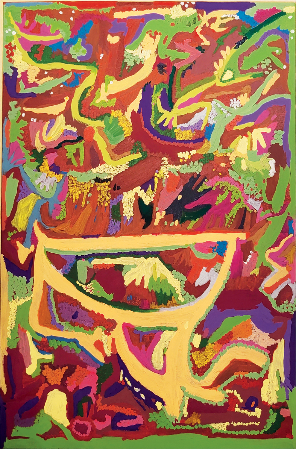 “Algumas telas possuem uma fatura delicada, miúda, com os pequenos pontos que ela gosta de inserir e se transformam em uma espécie de rendado. Outras se deixam levar por vetores fortes, com movimentos amplos. Outras vibram em tensões. Os acordes de cores também se modificam, com tonalidades dominantes, sempre em harmonia.”